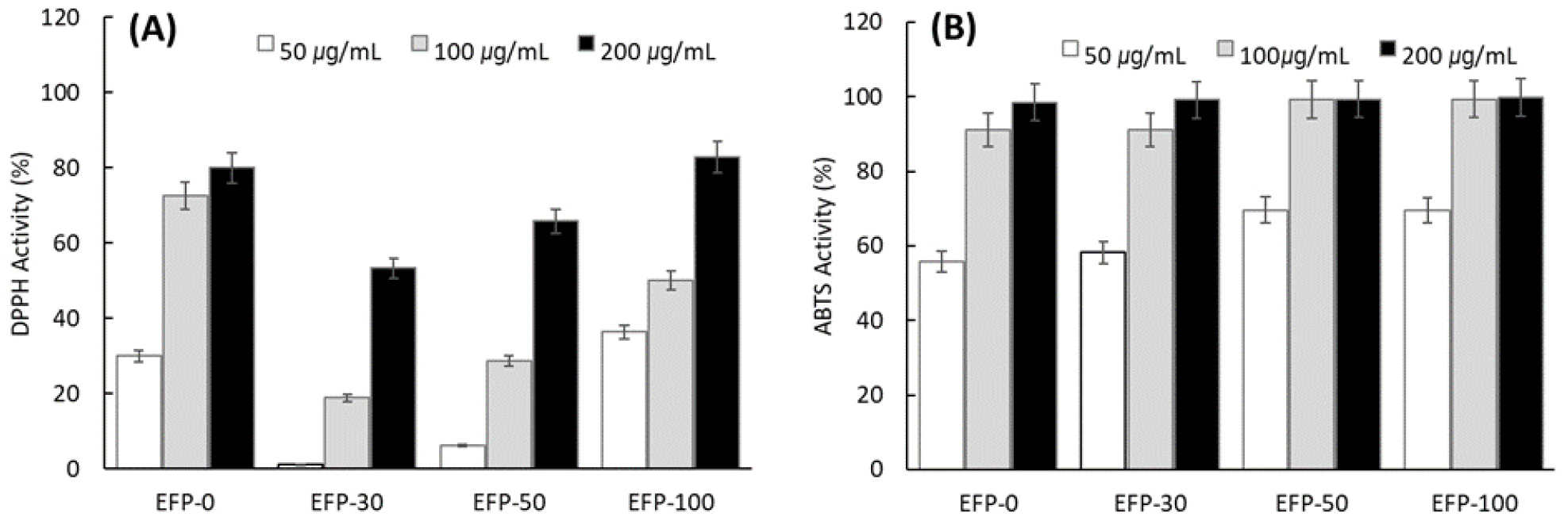 - This study examined the solvent-dependent antioxidant and anti-inflammatory activities of Okhwang 1ho (Abeliophyllum distichum) flower extracts prepared with varying ethanol concentrations (EFP-0, EFP-30, EFP-50, and EFP-100). Radical scavenging capacity was assessed via DPPH and ABTS assays (50~200 ㎍/mL). All extracts demonstrated marked antioxidant activity at low concentrations, while EFP-30 and EFP-50 exhibited superior activity, implying efficient extraction of moderately polar phenolic constituents. Total phenolic content was highest in EFP-50, whereas total flavonoid content increased with ethanol concentration. HPLC profiling confirmed distinct phytochemical signatures: EFP-0 contained rutin, caffeic acid, and acteoside, while EFP-30 and EFP-50 additionally contained isoquercitrin and isoacteoside. In RAW 264.7 macrophages, no cytotoxicity was observed up to 200 ㎍/mL. Under LPS-induced inflammatory conditions, EFP-50 and EFP-100 significantly suppressed NO production, consistent with phenolic/flavonoid enrichment. Western blot analysis further verified downregulation of iNOS and COX-2 expression, indicating inhibition of inflammatory signaling. Collectively, these findings demonstrate that the biological activities of A. distichum flower extracts are strongly influenced by solvent polarity, with 30~50% ethanol yielding optimal bioactive profiles. The study supports the potential application of A. distichum flowers as functional ingredients in health-promoting products. - COLLAPSE